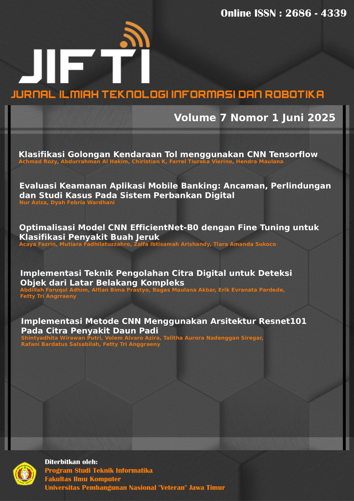 Pengelolaan lalu lintas di jalan tol memerlukan strategi yang efektif dalam mengidentifikasi jenis kendaraan untuk meningkatkan keamanan dan efisiensi transportasi. Artikel ini membahas implementasi Convolutional Neural Network (CNN) menggunakan TensorFlow untuk klasifikasi kendaraan di jalan tol. CNN telah terbukti efektif dalam mengenali pola visual kompleks, memungkinkan identifikasi kendaraan secara akurat tanpa perlu ekstraksi fitur manual. Dengan memanfaatkan arsitektur deep learning, CNN dapat mempelajari representasi fitur dari data citra dengan tingkat akurasi yang tinggi. Penggunaan TensorFlow sebagai framework deep learning memberikan keunggulan dalam pengembangan model dengan performa tinggi. Implementasi CNN dengan TensorFlow meningkatkan efisiensi dan akurasi klasifikasi kendaraan, membantu dalam mengelola lalu lintas dengan lebih efektif. Solusi ini meminimalkan kesalahan manusia, mempercepat proses klasifikasi, dan meningkatkan pengalaman pengguna jalan tol. Integrasi TensorFlow dalam sistem pengelolaan lalu lintas dapat menciptakan solusi yang lebih efektif dalam mengatasi tantangan di jalan tol. Model klasifikasi kendaraan ini mencapai 90.6% akurasi pada data uji. Sehingga dapat disimpulkan bahwa metode ini dapat secara efektif meningkatkan akurasi dan efisiensi dalam klasifikasi jenis kendaraan di jalan tol